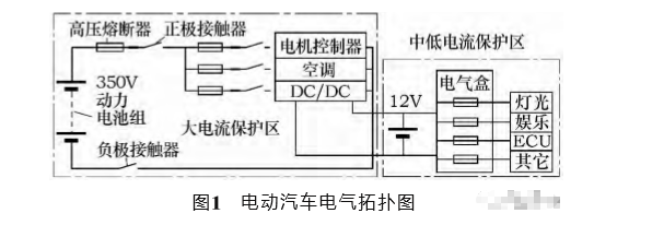 從應(yīng)用線路上考慮,整車線路根據(jù)電流強弱可以分為高壓大電流保護區(qū)和中低壓小電流保護區(qū)。一般情況下,一輛電動汽車使用4~5個高壓熔斷器,主要包括電機控制器、空調(diào)線路、DC/DC、電池組加熱器等高壓大電流設(shè)備。一輛電動汽車使用中低壓熔斷器數(shù)量較多,主要是汽車線路中的中央控制盒,包括燈光線路、音響線路、刮水器線路等電器設(shè)備。其中中低壓小電流保護區(qū),熔斷器可以按照傳統(tǒng)燃油車的規(guī)范條件去選擇,在此不再闡述。本文主要討論高壓大電流熔斷器選擇方法。電動汽車電氣拓撲圖如圖1所示。