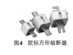 歐標方形熔斷器殼體采用陶瓷材質(zhì),該產(chǎn)品具有運行溫度低、功率損耗小、焦耳積分值(I2t)小等特點,適用于要求結(jié)構(gòu)緊湊、性能優(yōu)越、大功率應(yīng)用場合,尤其在手動維修開關(guān)(MSD)中大量使用。歐標熔斷器式樣如圖4所示。