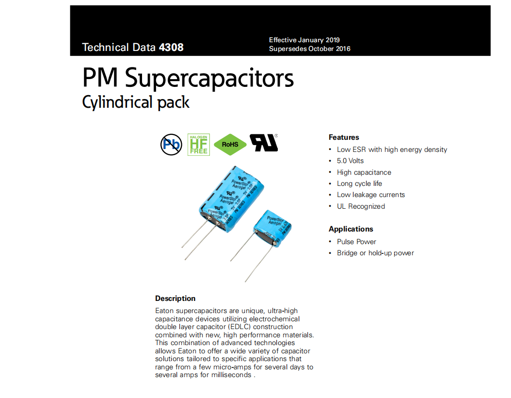 PM系列超級電容EATON PM-5R0H104-R PM-5R0H474-R PM-5R0H105-R PM-5R0H155-R PM-5R0V305-R PM-5R0V104-R PM-5R0V105-R PM-5R0H305-R PM-5R0V474-R PM-5R0V155-R